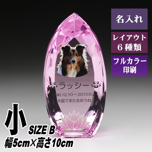 ・いつまでも心に生きる大切な家族のための美しいペットメモリアルです。 ・ピンクのクリスタルガラスがキラキラと優しく光を反射させるしずく形のペットメモリアルです。 ・縦長の形状なので、伝統的なお位牌のようにお名前などを加工することができます。 ・デスクの上などに置くと、ペットちゃんをいつもそばに感じることができます。 ・クリスタルにペットちゃんのお写真をフルカラー印刷いたします。 ・高級感のある化粧箱入りで、ギフト包装・贈答に最適な手提げ紙袋を無料でお付けします。 材質:エコロジークリスタルガラス サイズ: 【大】幅6.5cm×高さ13.5cm×奥行4cm 【小】幅5cm×高さ10cm×奥行4cm 包装:化粧箱入り 出荷目安:原稿確定後、3〜5営業日後の出荷です。(土日祭日は除く) ※オーダーメード品の為、お客様の都合による返品・交換は不可となりますのでご注文の際にお間違いのないようご注意ください。 ※ご注文後にお客様と当店スタッフとで彫刻原稿のやりとりを行い、最終原稿の図面をご確認頂き、お客様のご了承をいただき次第、制作・発送となります。 用途:ペット、ペット位牌、仏具、供養、葬儀、メモリアル ■UVカラー印刷とは? 最先端のダイレクト印刷機を使用し、クリスタル表面に直接印刷します。 フルカラーでの表現が可能で、透明のクリスタルとの相性は抜群です。 ※カラー印刷は写真と色味が異なる場合がございます。 ※印刷部分は強く擦ったりすると、はがれる場合がございます。 【ガラスについて】 ガラス・クリスタル製品は材料の特質上、内部に小さな気泡や不純物が見られる場合がございます。 また、素材その物の成型時に、研磨あと、筋、気泡による穴、カケなどが発生いたします。 透明度の高い美しいクリスタルを作るために致し方ないものとしてご了承いただきますようお願い申し上げます。