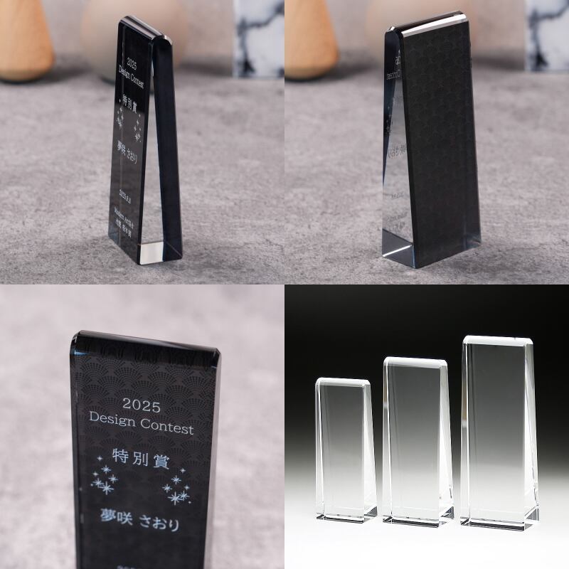 クリスタルの表面に文字を彫刻し、裏面は黒を基調としたデザイン。