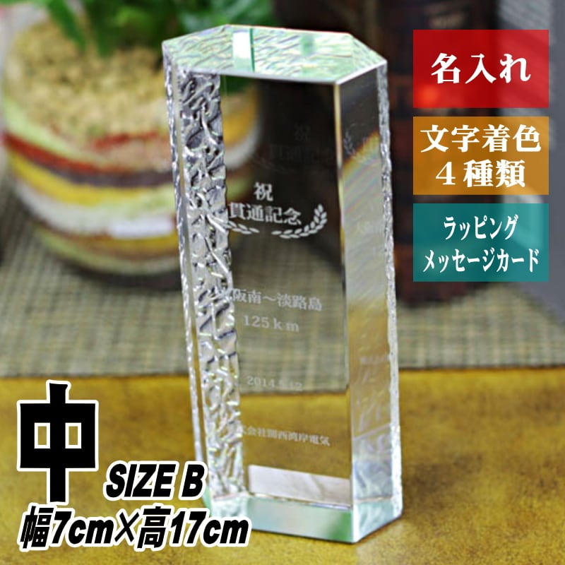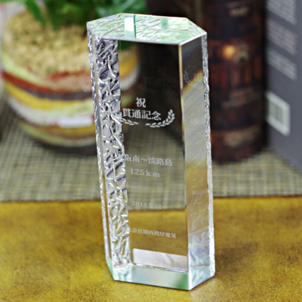 ・両サイドに施された斬新な模様と、六角柱のモダンなフォルムが魅力の美しいクリスタルトロフィーです。