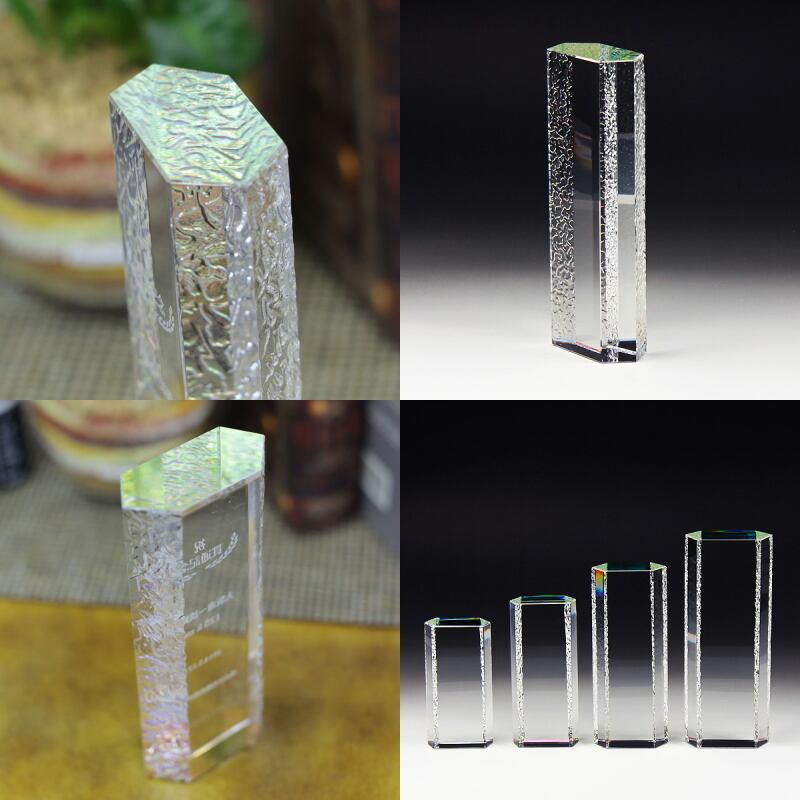 ・両サイドに施された斬新な模様と、六角柱のモダンなフォルムが魅力の美しいクリスタルトロフィーです。