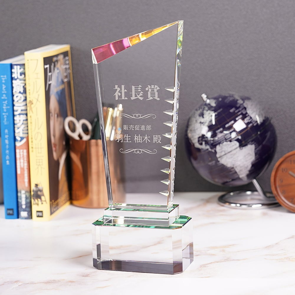 ・右上がりのシャープなクリスタルの背面に施されたカットが特徴的なトロフィーです。