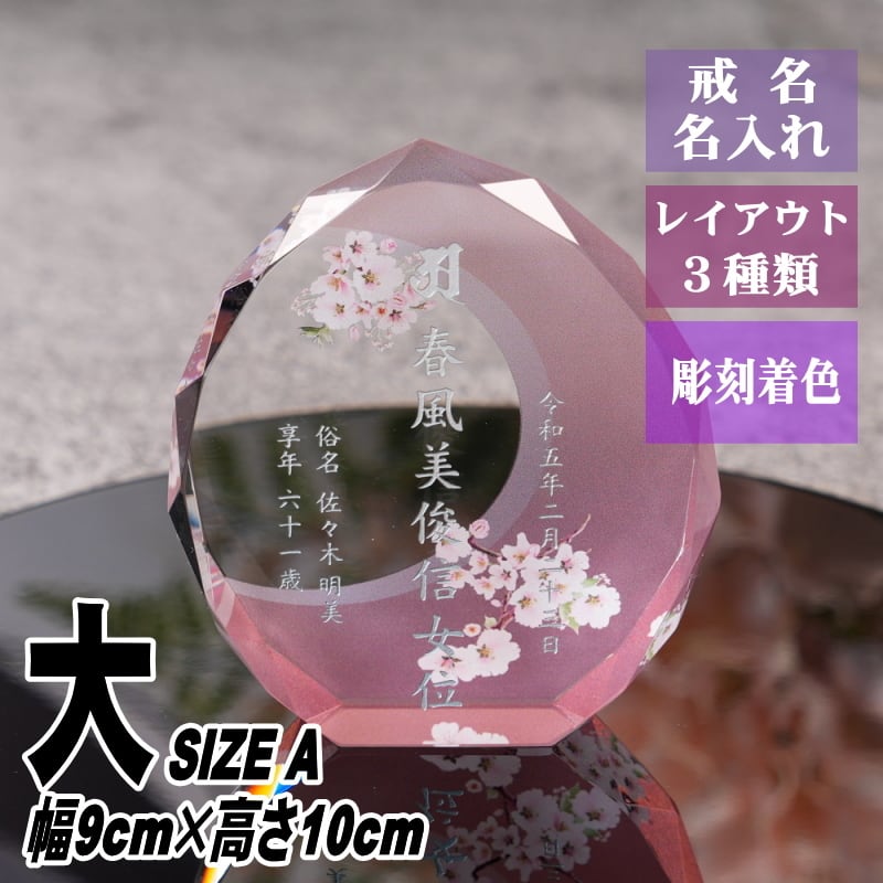 ・淡くナチュラルなフラワー柄と彫刻を美しく引き立てる金・銀・黒・白の着色を組み合わせた、上品で高級感あふれるクリスタル位牌「穏花(おんか)」です。