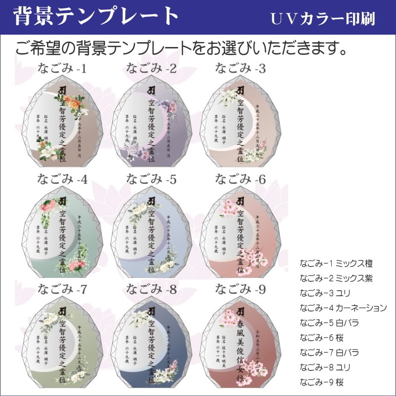 ・淡くナチュラルなフラワー柄と彫刻を美しく引き立てる金・銀・黒・白の着色を組み合わせた、上品で高級感あふれるクリスタル位牌「穏花(おんか)」です。