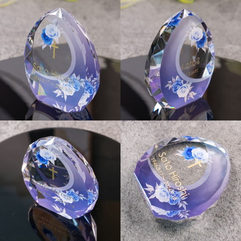 ・戒名やお名前は、日本の職人が一点一点丁寧に手作業でカット・研磨されたクリスタルに、心を込めて彫刻いたします。
