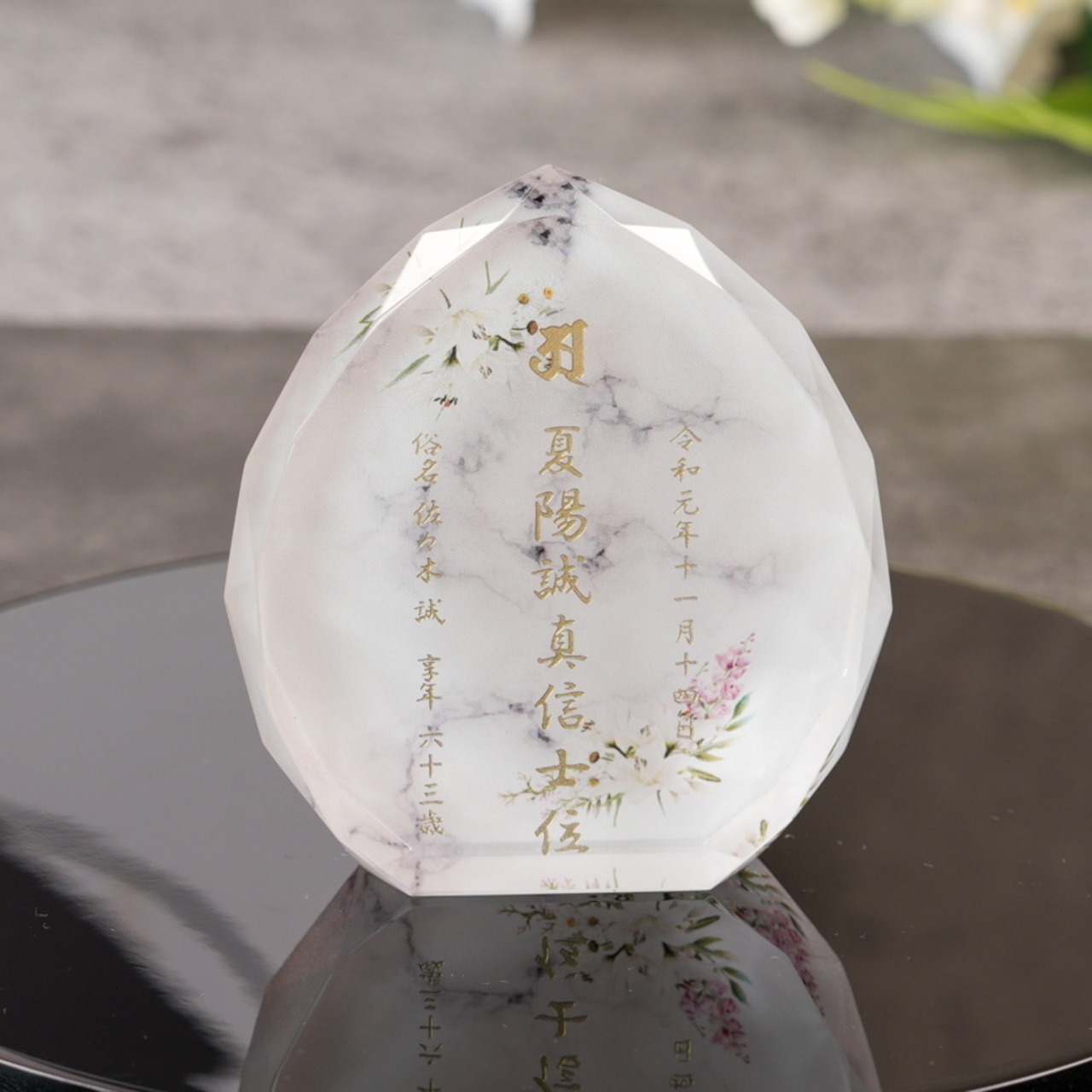 ・戒名やお名前は、日本の職人が一点一点丁寧に手作業でカット・研磨されたクリスタルに、心を込めて彫刻いたします。
