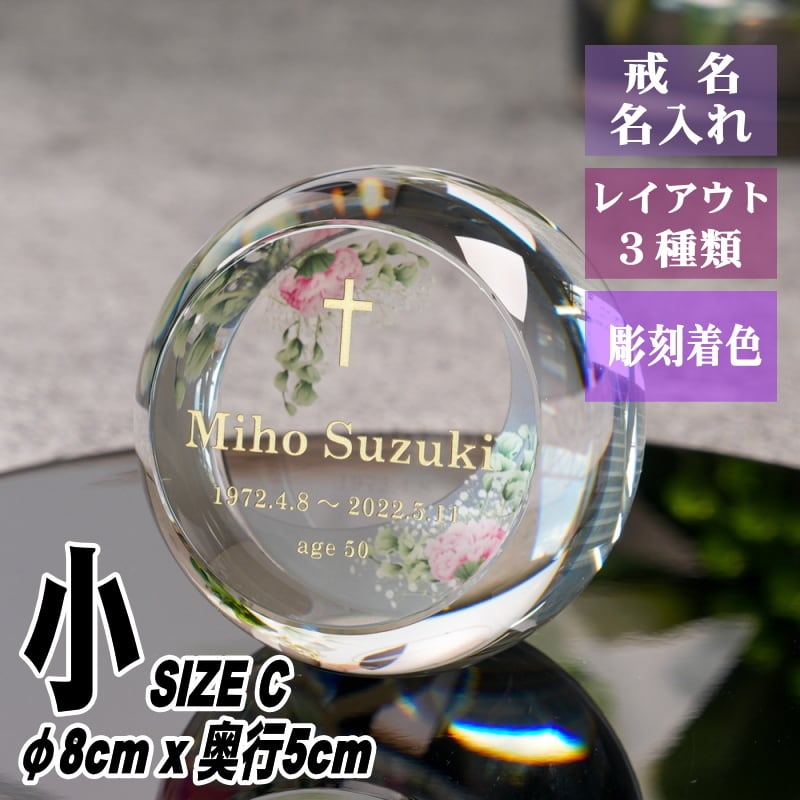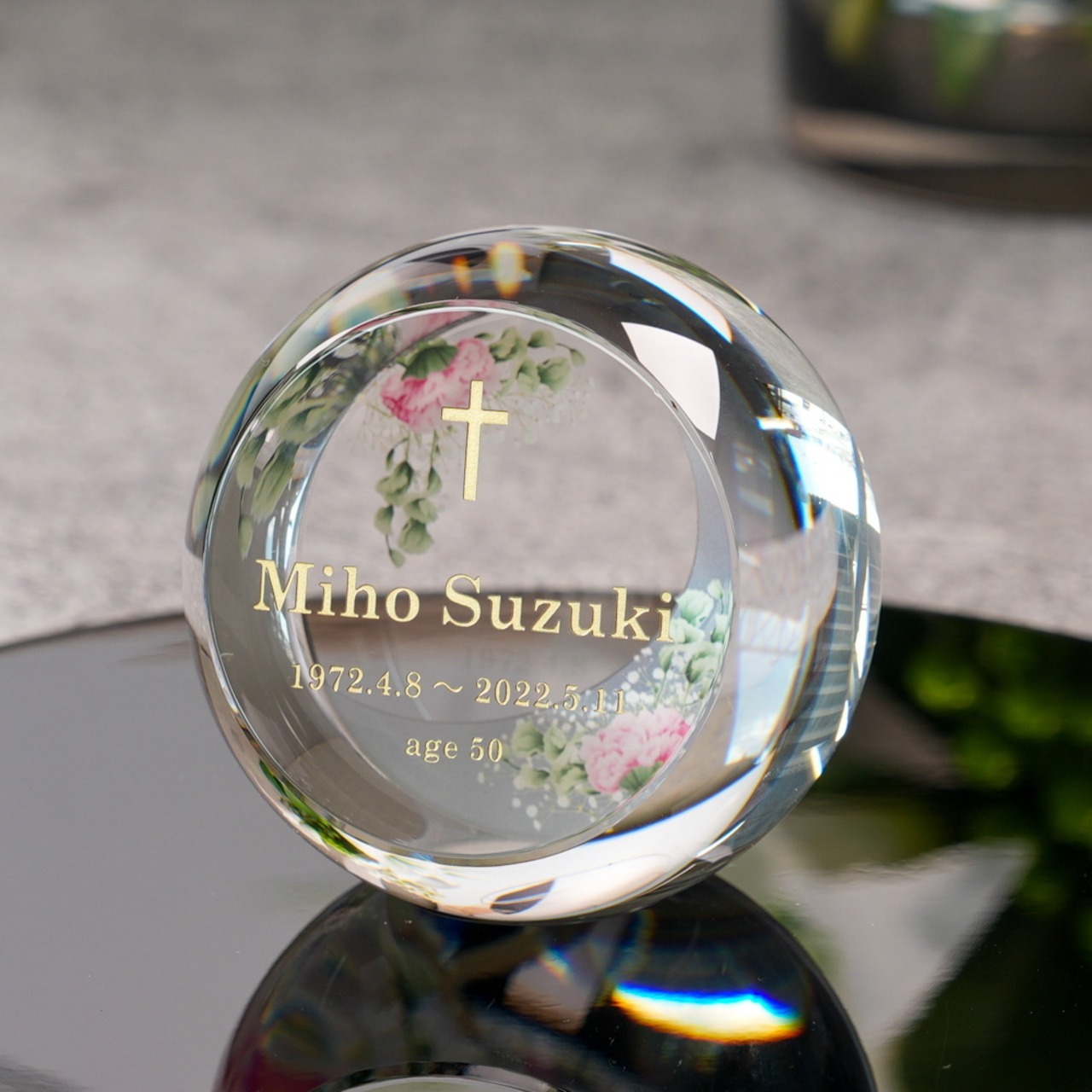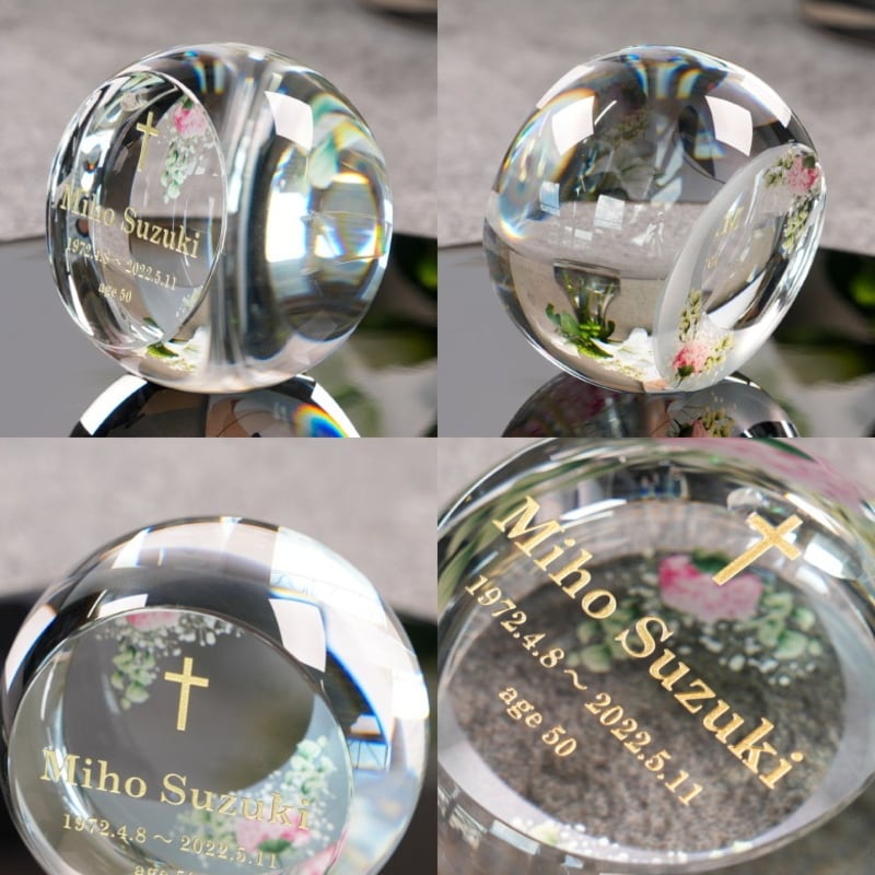 ・透明感のあるクリスタルガラスに繊細な柄が施され、光を受けるたびに優しく輝き、故人がそばにいるかのような安らぎの空間を演出します。