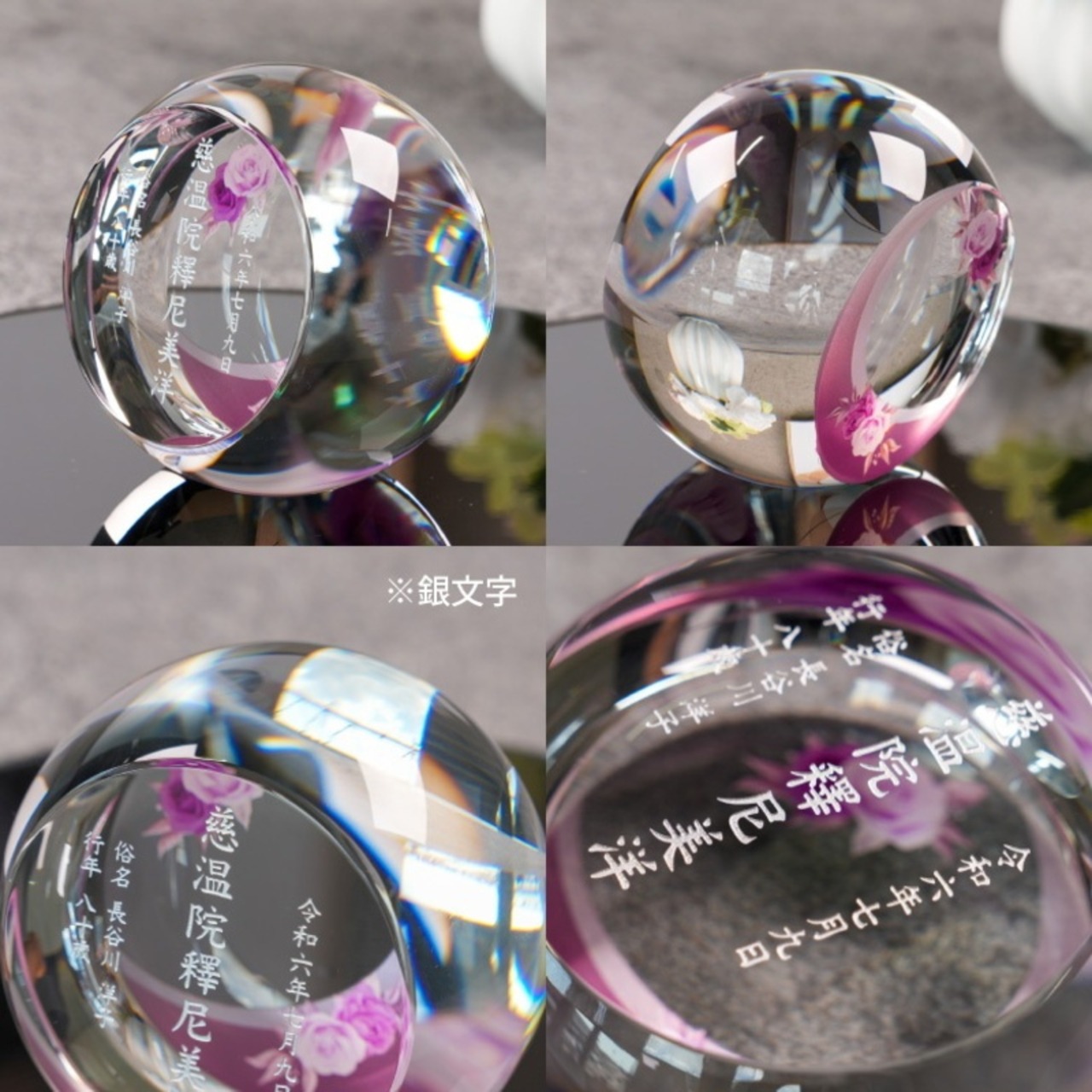 ・透明感のあるクリスタルガラスに繊細な柄が施され、光を受けるたびに優しく輝き、故人がそばにいるかのような安らぎの空間を演出します。