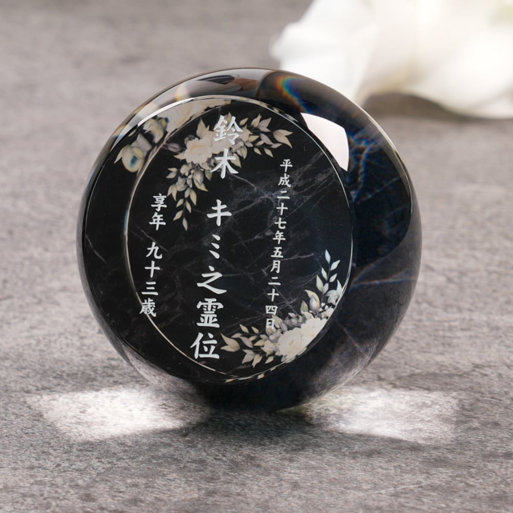 ・透明感のあるクリスタルガラスに繊細な柄が施され、光を受けるたびに優しく輝き、故人がそばにいるかのような安らぎの空間を演出します。