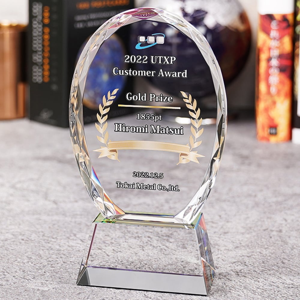 ・側面のダイヤカットがキラキラと光を反射させるオーバル形のクリスタルトロフィーです。
