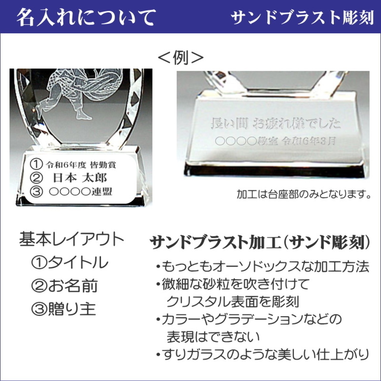 ・名入れはガラス彫刻なので、プレート貼り付けやプリントの商品のようにはがれたり、薄くなることがなくいつまでもクッキリと美しさを保ちます。