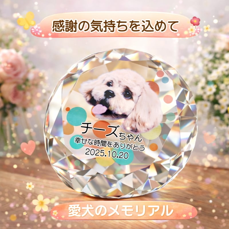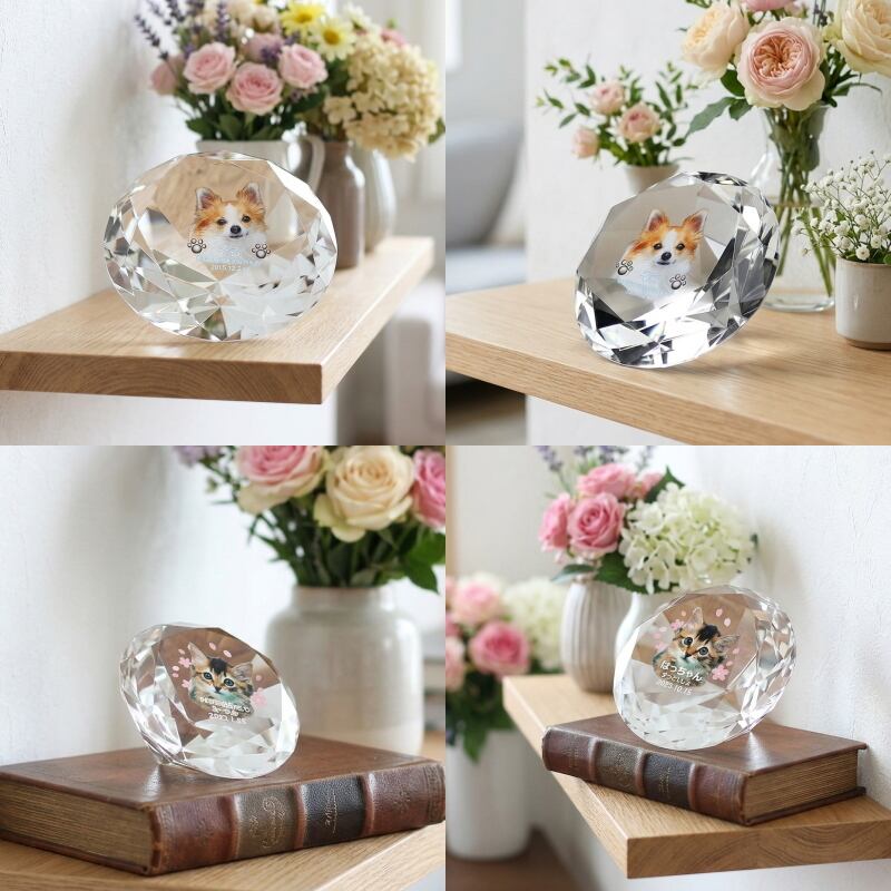 ・ダイヤモンドカットが光をキラキラと反射させる、宝石のようなペットメモリアルです。