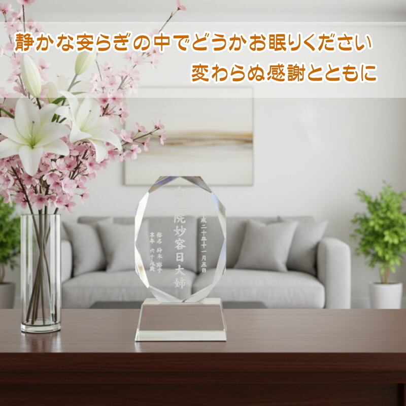 ・側面のダイヤカットがキラキラと優しく光を反射させるオーバル形の美しいクリスタルお位牌です。
