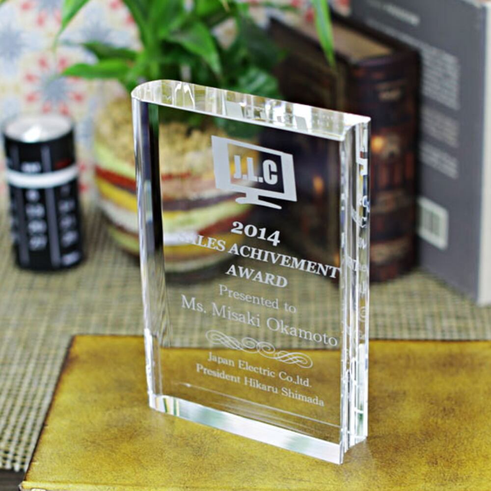 ・美しく名入れ彫刻されたクリスタル盾は受け取られた方の感動が違います。