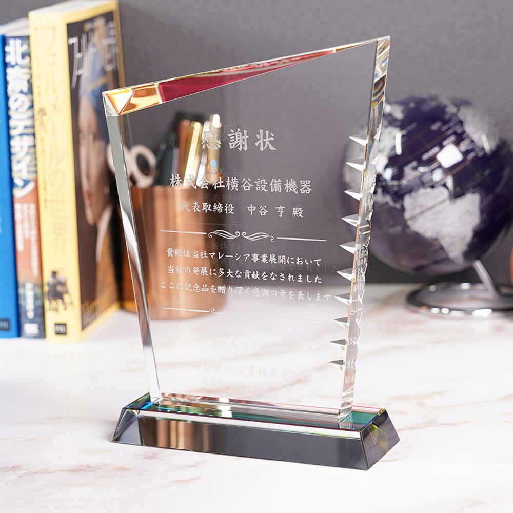 ・美しく名入れ彫刻されたクリスタル盾は受け取られた方の感動が違います。