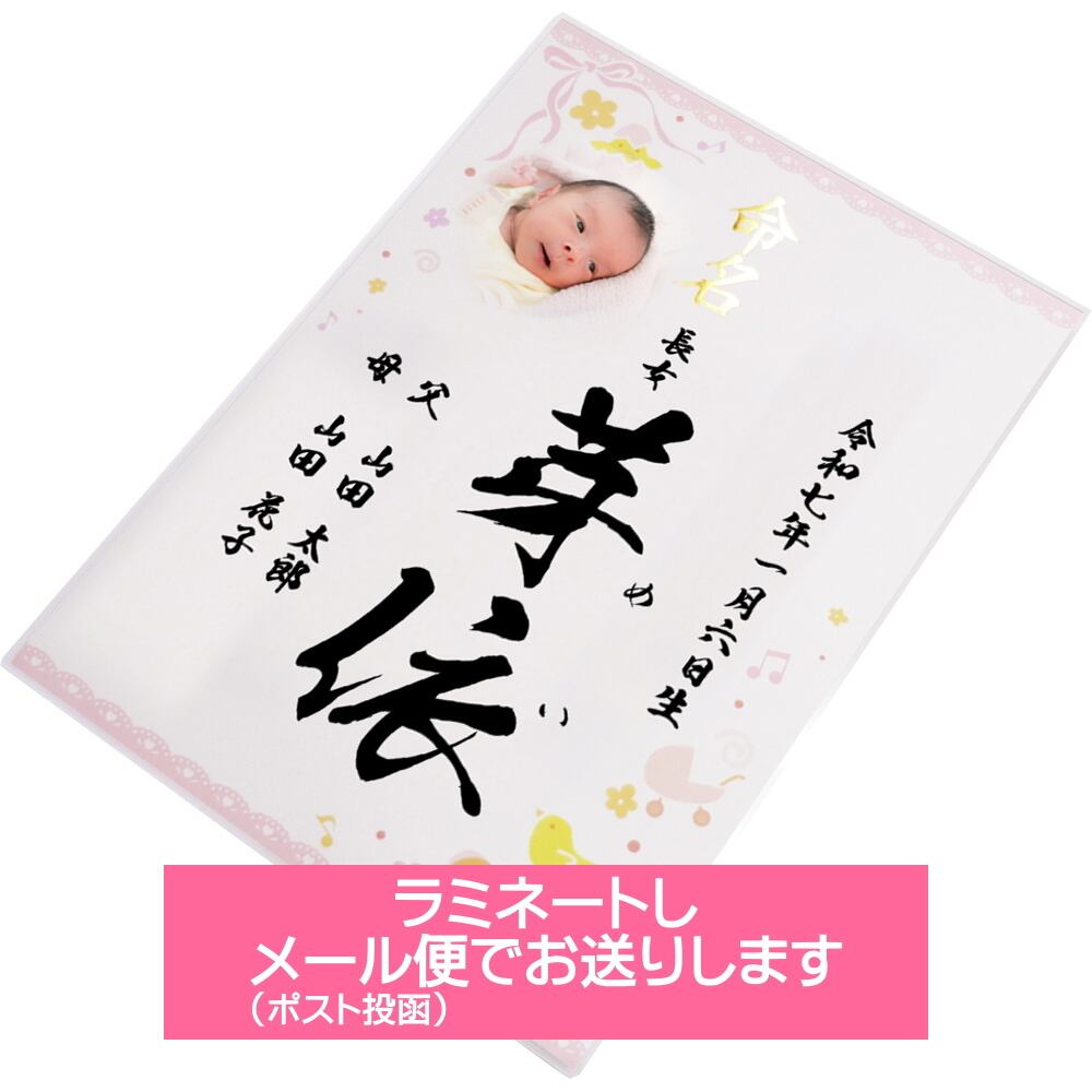 命名書 写真 代筆 手書き 風フォント ピンク 命名紙 女の子 A4 ラミネート 出産祝い 出産内祝い お七夜 / お名前+生年月日+ご両親